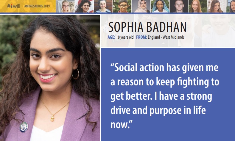 In 2019, Sophia was also selected as one of 50 new #iWill Ambassadors for the UK. The Campaign empowers young people to champion the causes most important to them and supports them in making a real difference to their communities. Find out more here.